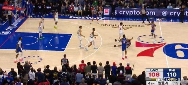比赛还剩1分44秒时,76人中锋德拉蒙德在身边一米范围内没有明确防守者的情况下在禁区待的过久,应该吹罚防守三秒违例,快船得到一次罚球机会。